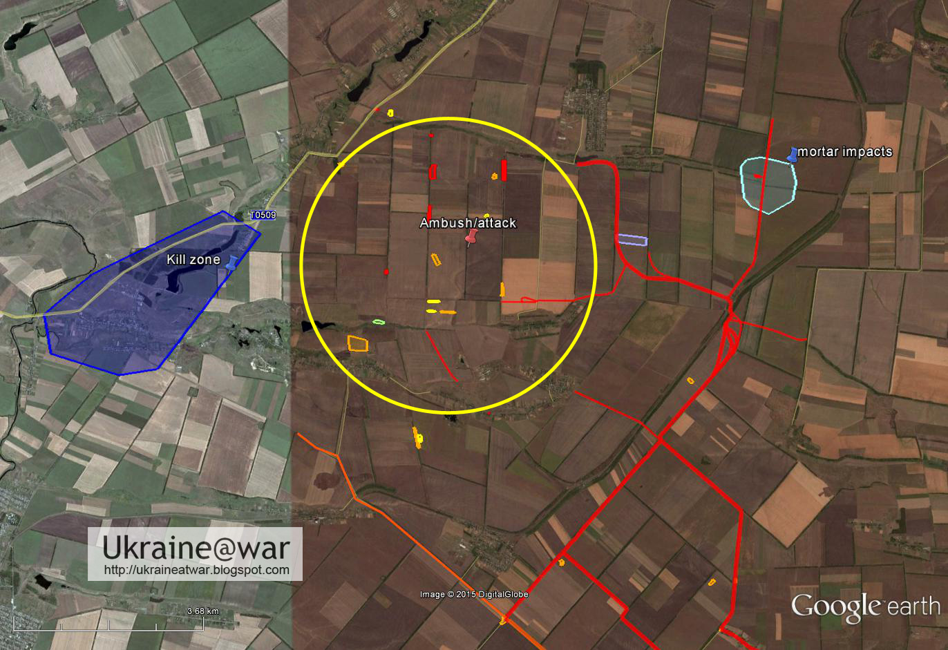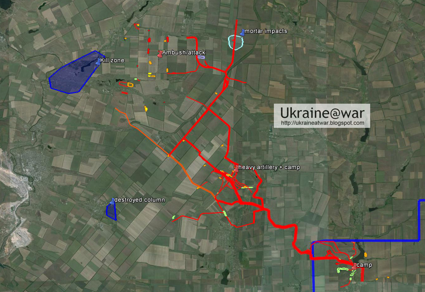 The blue line shows how the Ukrainian units were retreating. To get there they had already been fired on with artillery many times.